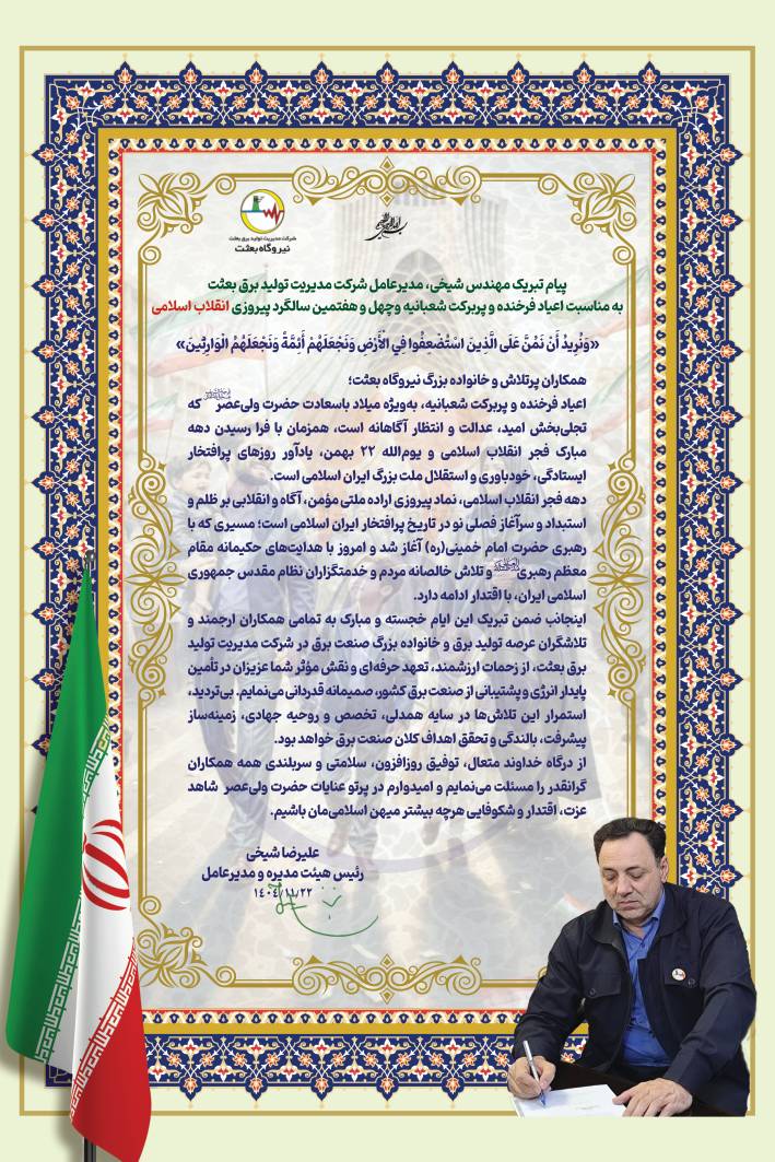 پیام مهندس شیخی، مدیرعامل شرکت مدیریت تولید برق بعثت به مناسبت اعیاد فرخنده و پر برکت شعبانیه و چهل و هفتمین سالگرد پیروزی انقلاب اسلامی ایران