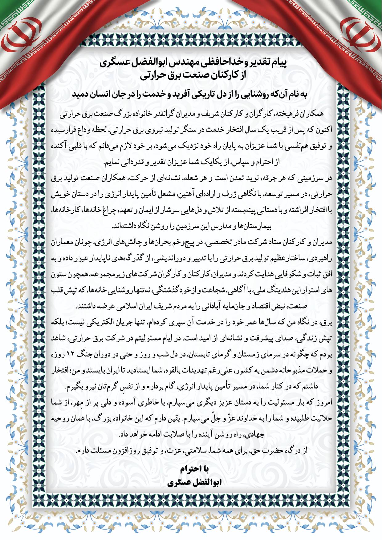 در سرزمینی که هر جرقه، نوید تمدن است و هر شعله، نشانهای از حرکت، همکاران صنعت تولید برق حرارتی، در مسیر توسعه، با نگاهی ژرف و ارادهای آهنین، مشعل تأمین پایدار انرژی را در دستان خویش با افتخار افراشته و با دستانی پینهبسته از تلاش و دلهایی سرشار از ایمان و تعهد، چراغ خانهها، کارخانهها، بیمارستانها و مدارس این سرزمین را روشن نگاه داشتهاند.